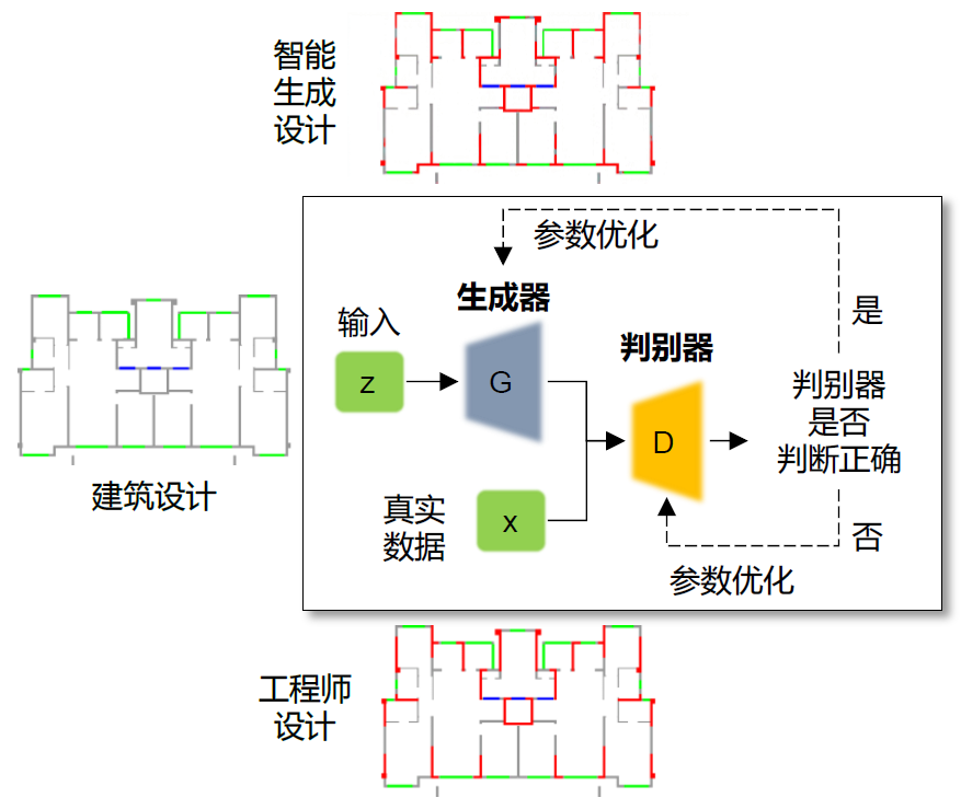 如果判别器发现结构方案是人工智能设计的,而不是工程师设计的,则生成器被判定“失败”,生成器去继续学习提升。如果判别器无法判别图纸是人工智能设计的还是工程师设计的,则判别器被判定“失败”,回去继续学习提升。判别器和生成器不断对抗提升,直至达到纳什均衡,这就叫“对抗生成网络”。(图4)