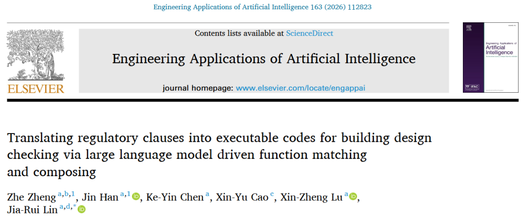 论文:Zheng, Z., Han, J., Chen, K. Y., Cao, X. Y., Lu, X. Z., & Lin, J. R. (2026). Translating regulatory clauses into executable codes for building design checking via large language model driven function matching and composing. Engineering Applications of Artificial Intelligence, 163, 112823.