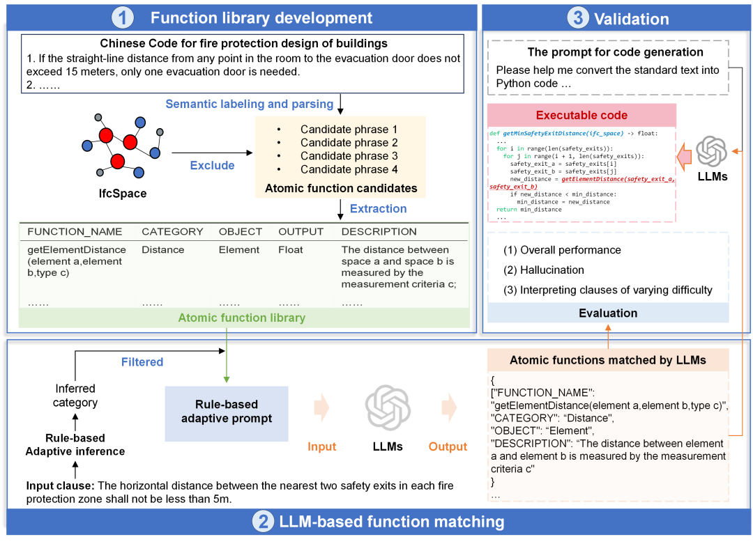 本研究的核心思路,就是建立一个"原子函数库"——把规范中反复出现的复杂计算逻辑(如"计算两空间距离"、"判断是否相邻"、"提取包含关系")拆解成66个基本"积木"。然后,利用大语言模型(LLM)这位"智能翻译官",通过精心设计的"提示词工程",让它自动识别每条规范需要哪几块"积木",再像搭乐高一样,把这些积木组装成完整的检查代码。