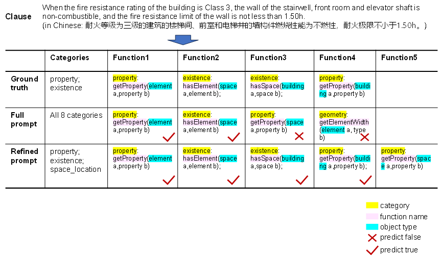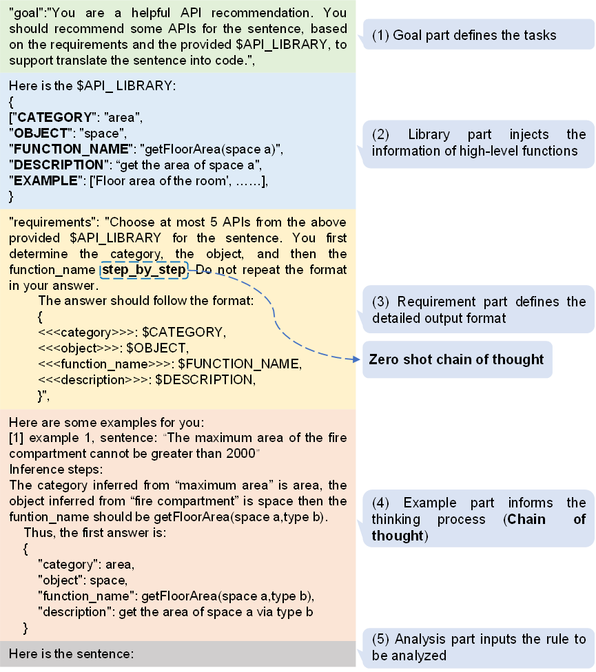 首先根据条文的关键词判断其可能包含的基元函数类别,并据此限定可选函数范围。这样,模型不再面对全部66个函数,而只需在相关类别中进行匹配,显著降低歧义与运算开销。例如,涉及“间距”的条文会在提示时引入距离类的所有函数以供模型选择。提示词模板如下图所示: