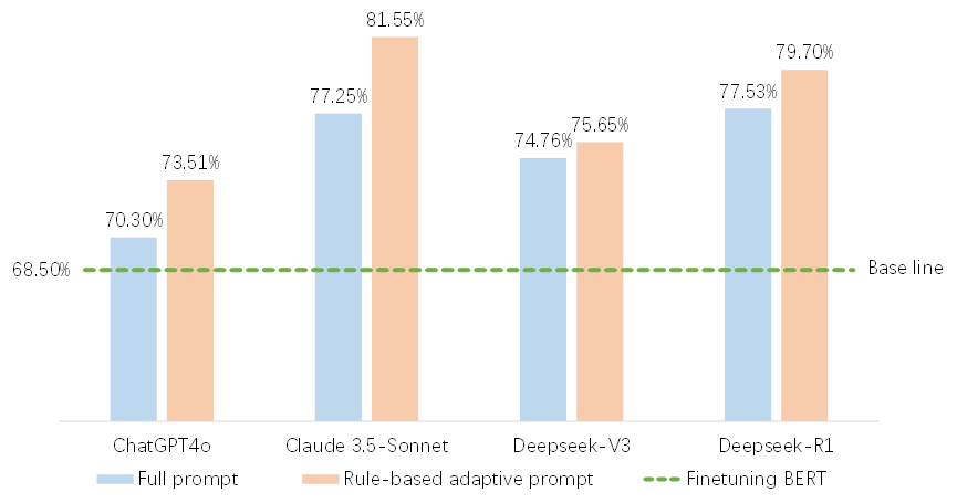 此外,本研就探究了不同大模型在函数匹配任务中的表现。实验选取了当时最具代表性的四个主流模型:ChatGPT-4o、Claude 3.5-Sonnet、DeepSeek-V3与DeepSeek-R1。同时为验证所提基于规则的自适应提示策略的有效性,本研究同样设置了完整提示输入和规则自适应提示输入两组对比实验。为了提供对照组,本研究还引入了经过微调的BERT模型,用于输出每条条文最有可能对应的五个函数。