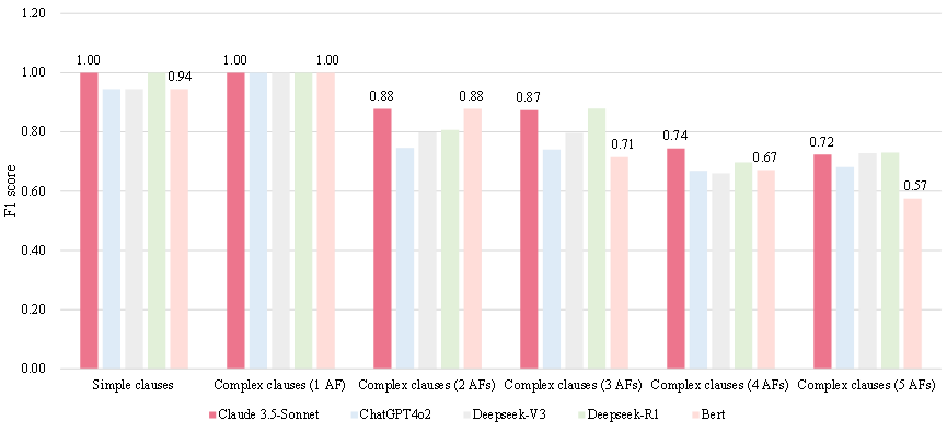 在采用规则自适应提示的前提下比较各大模型针对不同复杂度条文解释能力,结果如图6所示。对简单条文与仅含1个基元函数的复杂条文,模型的F1几乎接近 100%;当条文包含2-3个基元函数时,F1稳定高于0.8,并显著优于微调BERT。当条文复杂度进一步提升至4-5个基元函数的组合时,预测准确率出现下滑。各模型中,Claude 3.5-Sonnet表现最佳。