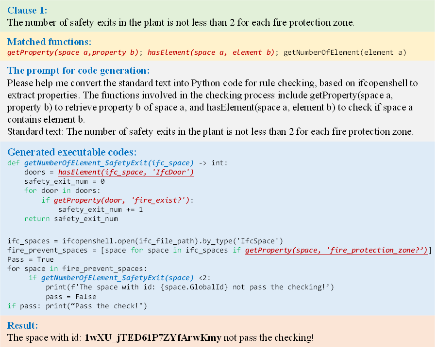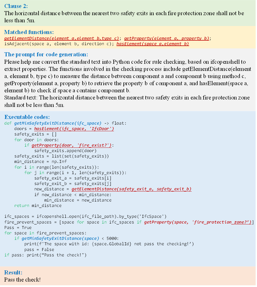 在匹配结果中,条文1需3个基元函数,其中2个匹配正确;条文2需4个基元函数,其中3个匹配正确。图7(a)和(b)中红色标记的部分为模型准确识别的函数,这些函数随后被自动转译为Python代码,实现了条文逻辑的程序化表达。具体而言,本研究将条文、匹配函数及提示词一并输入DeepSeek-R1,由模型自动生成最终的规则检测代码,代码可直接运行于IFC模型之上以执行检测任务。