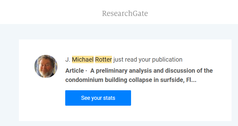 后来我因为研究方向变化,一直没有机会再见到Rotter教授,只是在网上联系。他一直非常热爱科研,在2021年美国佛罗里达公寓倒塌事故后,我还收到ResearchGate发来的通知,说Rotter教授刚刚阅读了我们关于事故分析的论文。不想今天在朋友圈得知Rotter教授不幸离世,谨以此文纪念这位在我求学阶段指导过我的可敬的前辈学者。