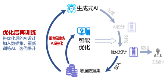 生成式AI的基本原则就是照猫画虎,所以学习样本的质量对AI设计结果至关重要。考虑到我们建立的工程师设计案例库存在一定的质量参差不齐,我们采用费一凡等同学提出的“智能优化大法”,对训练数据集进行了系统的大规模优化,从而显著提升了训练数据集和设计结果的质量,整个流程如下图所示:
