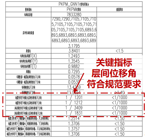执行“结构分析与优化”操作后,AI对生成的方案进行优化调整,如下图所示。优化前X方向层间位移角为1/935,Y方向层间位移角为1/880,不满足规范要求;优化后X方向层间位移角为1/1201,Y方向层间位移角为1/1212,调整后可完全满足规范要求。同时,软件也会将更新后的设计结果和计算指标同步绘制在CAD中。