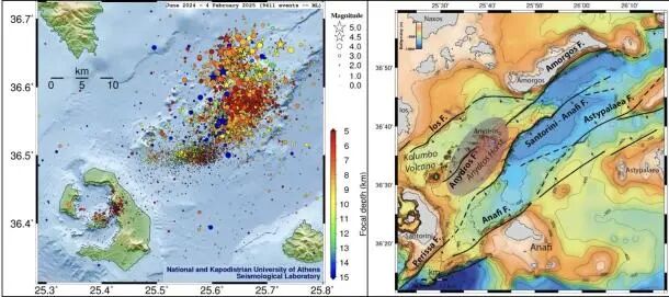自1月26日开始,圣托里尼岛周边就进入了“振动”模式,据雅典国家技术大学(ΕΚΠΑ)的报告,在22天内,圣托里尼(Santorini)和阿莫尔戈斯(Amorgos)之间海域记录了超过21,500次地震。截至2月17日,已经记录到震级大于4.0级的地震有129次,最强记录为 ML 5.2 级。大多数地震的震源深度在10至15公里之间。高峰时段,当地居民几乎每隔几分钟就感觉到一次地震。