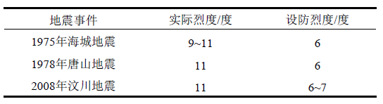 地震灾害的发生具有随机性大和不确定性强的特点,新中国成立以来,我国已经发生了多次远超当地的建筑结构抗震设防烈度的地震,在震中区域的结构甚至遭受了超过规范规定的9度罕遇的地震烈度,如表1所示。