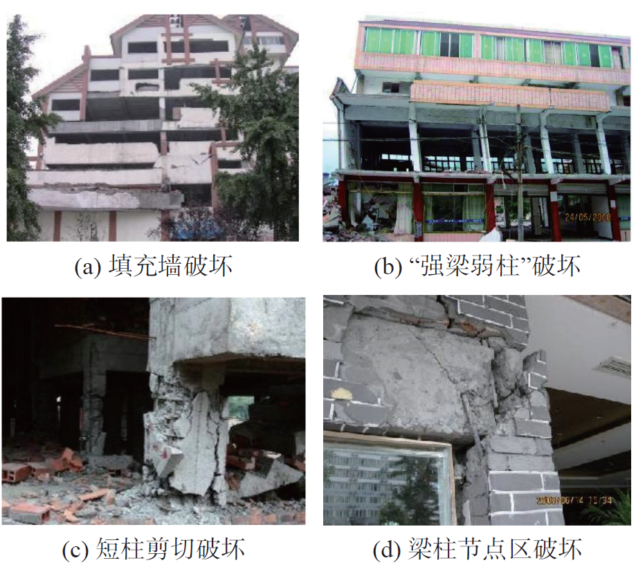但在汶川地震中,根据当时震害调查专家组公布的数据[6],大量按照最新抗震规范设计的房屋发生了严重的破坏,甚至倒塌,如图1。以框架结构为例,在汶川地震中发生了大量的填充墙等非结构构件严重破坏,且规范要求的“强柱弱梁”破坏机制几乎未发生[40],如图2。惨烈的人员伤亡和巨大的经济损失引起大量学者对提升建筑结构抗地震倒塌能力的设计方法和抗震计算理论的讨论。