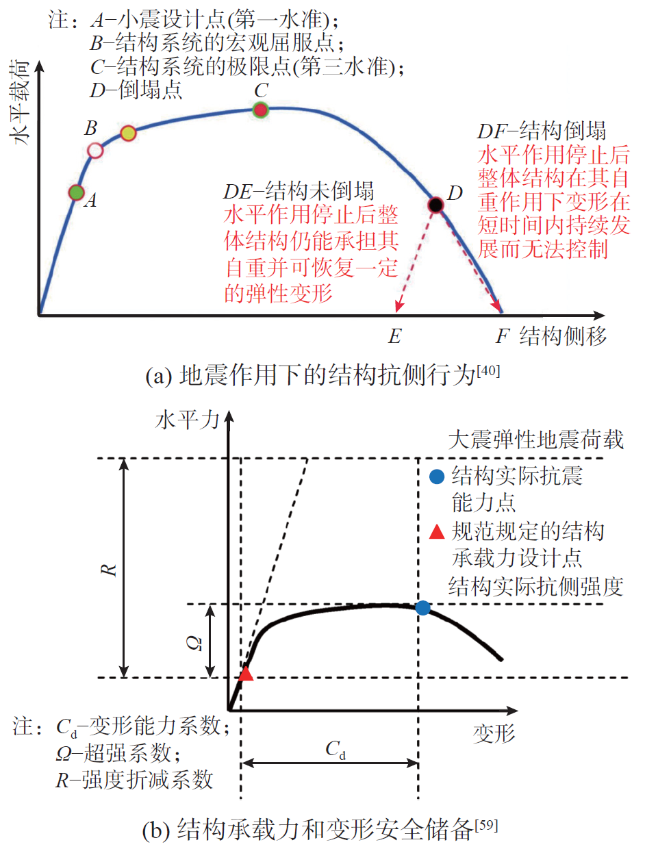 虽然汶川地震后,越来越多学者意识到结构鲁棒性的重要性,但当时对鲁棒性的定义和定量的评价仍处于初步阶段。陈肇元院士[56]认为结构鲁棒性是结构出现局部破坏后不致引发大范围连续破坏倒塌的能力;叶列平等[57]认为结构鲁棒性是避免结构垮塌为目标的整体结构安全性,并从系统论的角度介绍提高结构整体抗震能力的设计思想,根据建筑结构在地震荷载下的性能点(图3(a)),讨论不同阶段鲁棒性、整体稳定性和整体牢固性对结构抗倒塌能力的影响。在此基础上,陆新征和叶列平[58]从构件层次和整体结构层次的安全储备角度出发,分析了影响结构体系鲁棒性的因素,讨论了结构在罕遇地震下的承载力储备与位移延性的关系,如图3(b)。