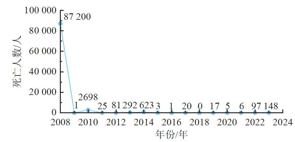 意外事件(包括超载、施工不当、车辆撞击、恐怖袭击等)导致的连续倒塌和极端地震灾害下的结构倒塌是最常见的两种建筑倒塌原因。在汶川地震之后的十余年时间里,由于我国未出现接近汶川地震烈度的震害,同时,随着结构抗震规范的更新和抗震设计水平的提高,地震造成的人员伤亡数量大幅降低(图6)[68],学界对地震倒塌研究的关注度有所降低。但是,随着近年来的一些知名的建筑倒塌事件和极端地震灾害事件的发生,学界不断在思考如何有效提升结构的抗倒塌能力。