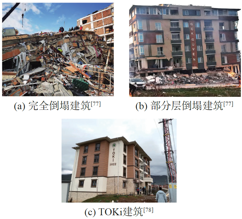 在本次地震中,王涛等[77]的现场震害调查表明:建造年代较早(2000年以前建设)的建筑主要以叠合式倒塌为主,如图10(a);2000年之后建造的建筑质量较好,底部几层发生倒塌后,上部楼层的强度足以使其在地震中保存下来,形成部分层倒塌的废墟,如图10(b)所示。曲哲[78]的现场考察表明,位于震中附近的政府保障性住房(TOKi)几乎未出现结构性破坏,如图10(c)。中东科技大学的地震工程研究中心发布的调查报告[79]中总结了这一结构体系在震中在此次地震中表现优异的原因:(1)大量使用剪力墙,剪力墙截面面积超过楼面面积的2.5%;(2)场地条件较好。根据现场的震害调查,此次地震中建筑物倒塌的主要原因有[76-77]:(1)老旧建筑抗震措施不足,大量采用低强度材料、光圆钢筋以及结构体系不佳;(2)场地效应(液化现象)导致一些受影响严重的建筑物基础最大沉降量达到了80cm;(3)强地面运动等。陆新征等[76]进一步开展此次地震中强地面运动对我国建筑的破坏能力模拟分析,结果表明,按照我国规范8度抗震标准设计的混凝土框架、钢筋混凝土剪力墙、钢筋混凝土框架核心筒和钢框架—支撑核心筒均发生倒塌。