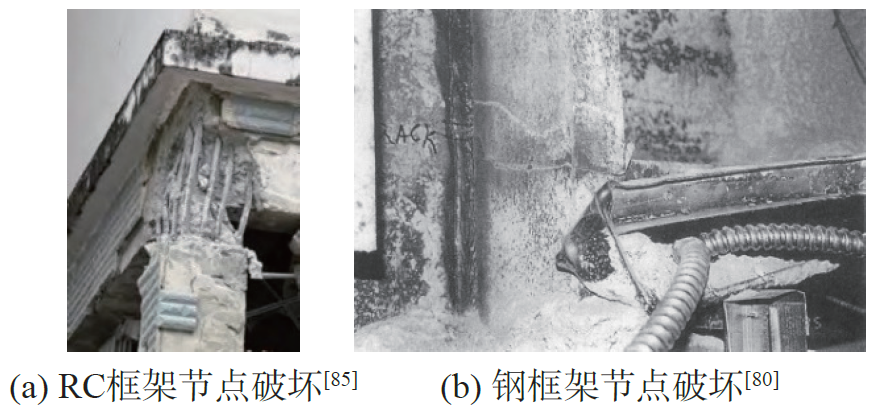 根据北岭地震[80]、神户地震[81-82]、汶川地震[83]、玉树地震[84]和泸定地震[85]的震后调查报告显示,RC框架(图11(a)所示)和钢框架结构(图11(b)所示)的节点区破坏严重,且破坏形式多为剪切破坏,节点区作为建筑结构的关键部位,受力情况非常复杂,在地震作用下其破坏行为难以模拟,既有研究中的节点模型主要包括宏观单元模型[86](图12(a)所示)和精细模型[87](图12(b)所示)两种。