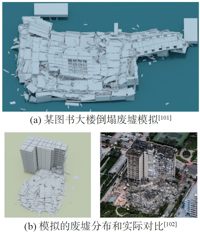 为此,Xu等[100]提出采用物理引擎和有限元模拟相结合的方法实现结构倒塌的废墟模拟。物理引擎通过使用对象属性(动量、扭矩或者弹性)来模拟刚体行为,与结构倒塌后残块的掉落力学行为相符,因此可以较好开展结构倒塌的废墟模拟,Xu等[100]以沱江大桥的倒塌事故说明了该方法的准确性。Zheng等[101]同样基于有限元方法和物理引擎,提出了一个混合的系统框架来模拟建筑结构倒塌和废墟场景,如图13(a),在此基础上,Lu等[102]应用该方法模拟了迈阿密的海滨公寓大楼倒塌事故,如图13(b)。除此以外,也有一些学者基于有限元方法的二次开发[103]、AEM方法[104]或深度学习[105]等,开展建筑倒塌废墟的模拟。