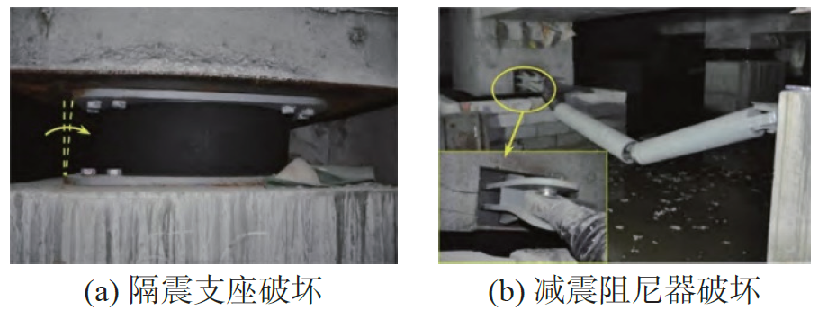 自汶川地震之后,国内的建筑大量采用减隔震体系,减隔震装置对减小建筑上部结构的地震响应效果显著,但泸定地震的震害调查结果表明,一些隔震支座的变形超过位移限制,部分阻尼器在地震发生前已经发生破坏[201],如图16所示。这些减隔震装置破坏后,一方面,可能由于其退出工作而加重了结构损伤,另一方面,既有文献对于这类建筑的倒塌相关研究(例如减隔震建筑的地震倒塌、连续倒塌机制及抗倒塌设计要求等)也十分有限。此外,设置了减隔振装置后,上部结构与相邻结构的碰撞问题也需要得到重视。