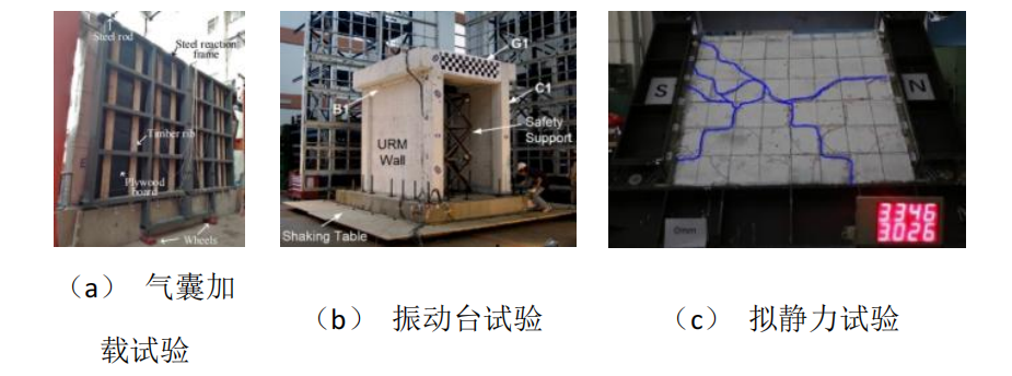 外围护构件坠落触发同时受到面内变形和面外加速度(惯性力)的影响,一些学者开展了针对性的试验研究,主要包括拟静力试验与振动台试验。其中,考虑面外惯性力影响的试验方法主要有图1所示三种[23-30]。Lu 等通过将填充墙体倾斜来模拟面外加速度,同时在面内施加水平力引起墙体的面内破坏,研究外围护构件的坠落触发机制,并给出了相应的计算方法[31]。Tian等开展了点支幕墙的面内破坏实验,确定了不同玻璃的破坏层间位移角[32]。