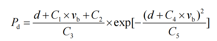 式中,Pd为所需计算区域(宽度为1 m)坠物分布密度,vb为某楼层砌块抛出时的初始速度(m/s),d为所需计算区域与建筑之间的距离(m),C1至C5为常数,各楼层取值不同。需要注意的是,在实际震害中,地面上各区域内的坠物可能来自建筑的各个楼层,当计算得到各楼层坠物对应的坠物密度后,采用线性叠加方式可以计算地面各区域最终的坠物分布密度。