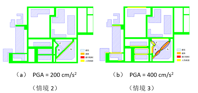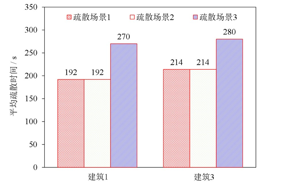在上述研究基础上,Lu等提出地震次生坠物情境人员疏散模拟方法(图3)。该方法主要包括:(1)区域建筑和道路基础数据库;(2)区域建筑非线性时程分析;(3)坠物分布计算;(4)疏散情境构建与模拟。并基于某校园教学区进行了案例研究。该案例中考虑了有无坠物以及多个PGA建立了三种疏散情境,其中情境1为无坠物情境,情境2与情境3在有坠物的基础上,其PGA分别为200 cm/s2与400 cm/s2。通过模拟得到不同情境下该教学区的坠物分布图,识别被坠物堵塞的道路及对人员运动的影响程度(图4);此外,依据坠物分布结果与人员行进速度,得到了不同情境下的疏散时间(图5)[42]。结果表明:考虑坠物后人员疏散时间显著增加,且密集建筑区坠物覆盖面积较大,显著增加了人员疏散时所面临的风险。该方法可以为震后应急疏散、城市规划提供决策依据和技术支持。