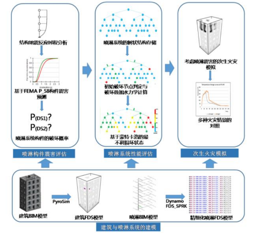单体建筑地震次生火灾研究需要重点解决多灾害耦合问题。由于建筑震后火场存在非结构构件震害、地震次生火灾、次生坠物等多种灾害,多种灾害的耦合作用极大的影响建筑的可燃性,尤其是喷淋系统的破坏会大大削弱其对火灾的抑制能力,对地震次生火灾影响极大。而现代建筑由于日益复杂,其建筑抗火对喷淋设施的需求也特别强烈,一旦喷淋设施破坏,则火灾后果会加倍严峻。