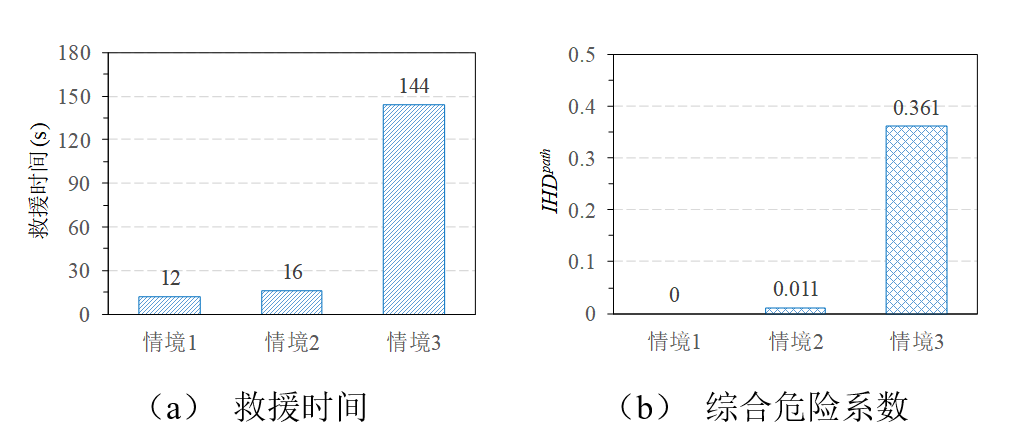 在上述研究基础上,Lu等考虑建筑震害、火灾蔓延和次生坠物等灾害的复杂耦合作用,提出了一套适用医院等重点建筑震后火灾救援场景模拟方法(图8),主要包括:(1)建筑BIM模型;(2)Unity建模;(3)构件震害评估;(4)次生火灾模拟;(5)VR场景建立。并以某19层医院为例进行了案例研究。具体而言,Lu等对该医院进行了地震响应时程分析,并考虑震后喷淋系统破坏情况、吊顶坠落情况等因素开展不同情境下建筑火灾模拟,其中情境1和情境2均为喷淋系统无震害,情境3为喷淋系统有震害。不同情境下的分析结果见图9与图10。研究结果表明,当考虑震后喷淋系统破坏与吊顶坠落时人员救援所需时间增加将近800%,危险系数增加3200%[42]。该模拟结果可为震后高真实感建筑火场环境的建立提供科学依据,为消防救援训练提供了技术支持。