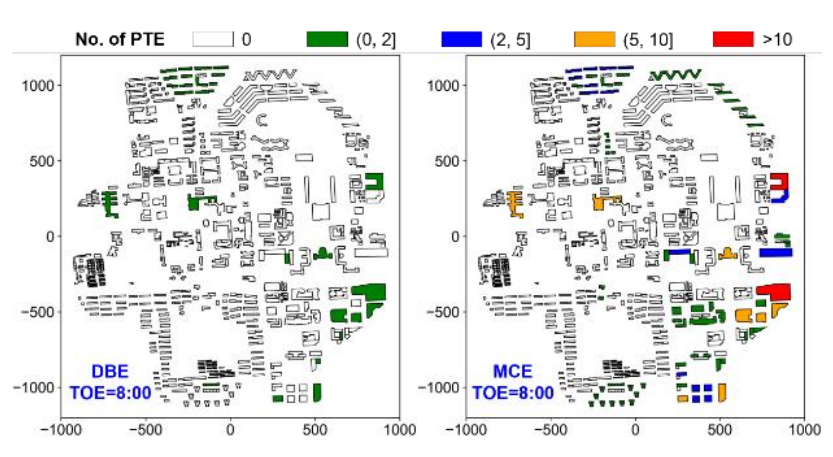 图12 DBE和MCE强度水平下建筑PTE数量分布[78]