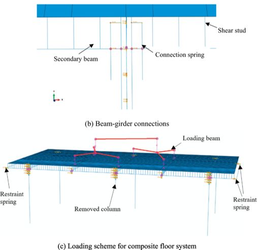 连续倒塌是整体结构系统的大变形力学行为,基于试验可以对局部子结构在临界倒塌大变形下的受力机理进行分析,但是最终研究和设计要采用数值模拟针对整体结构系统展开,以研究结构系统的替代传力路径、结构冗余度等对连续倒塌的影响。典型数值分析模型包括实体单元模型、纤维模型以及引入弹簧单元的简化模型等。