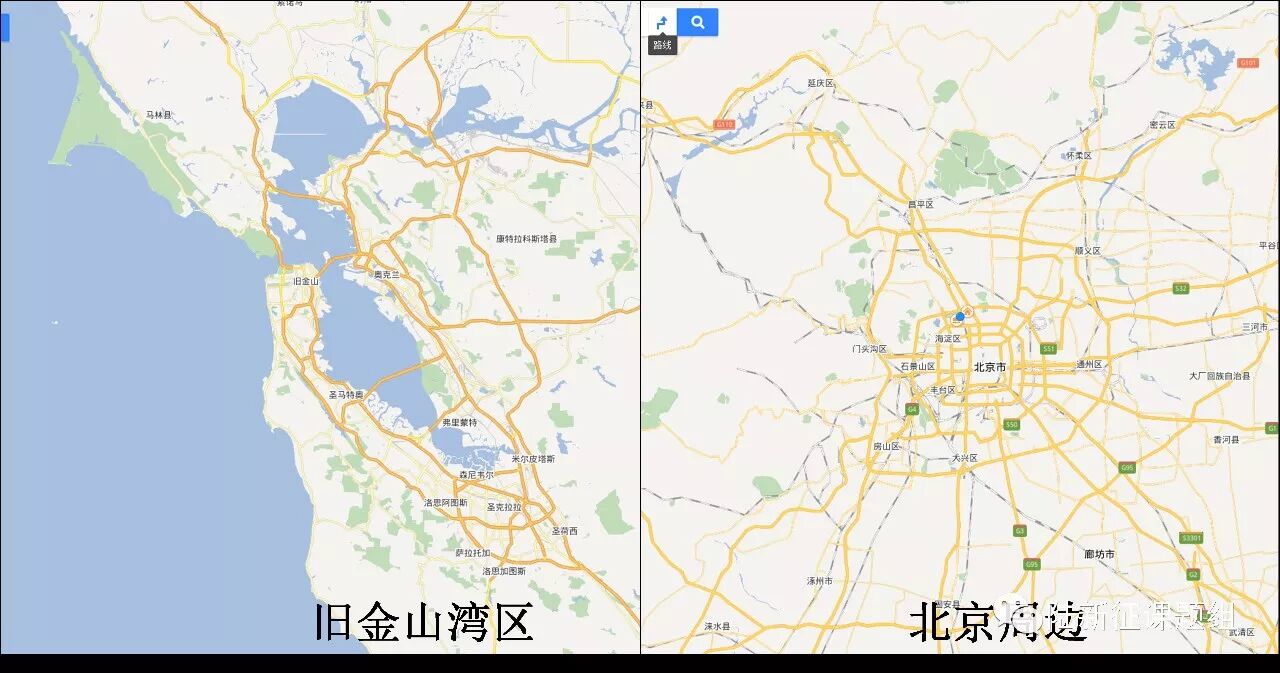 图6 同样比例尺下旧金山湾区和北京地图对比