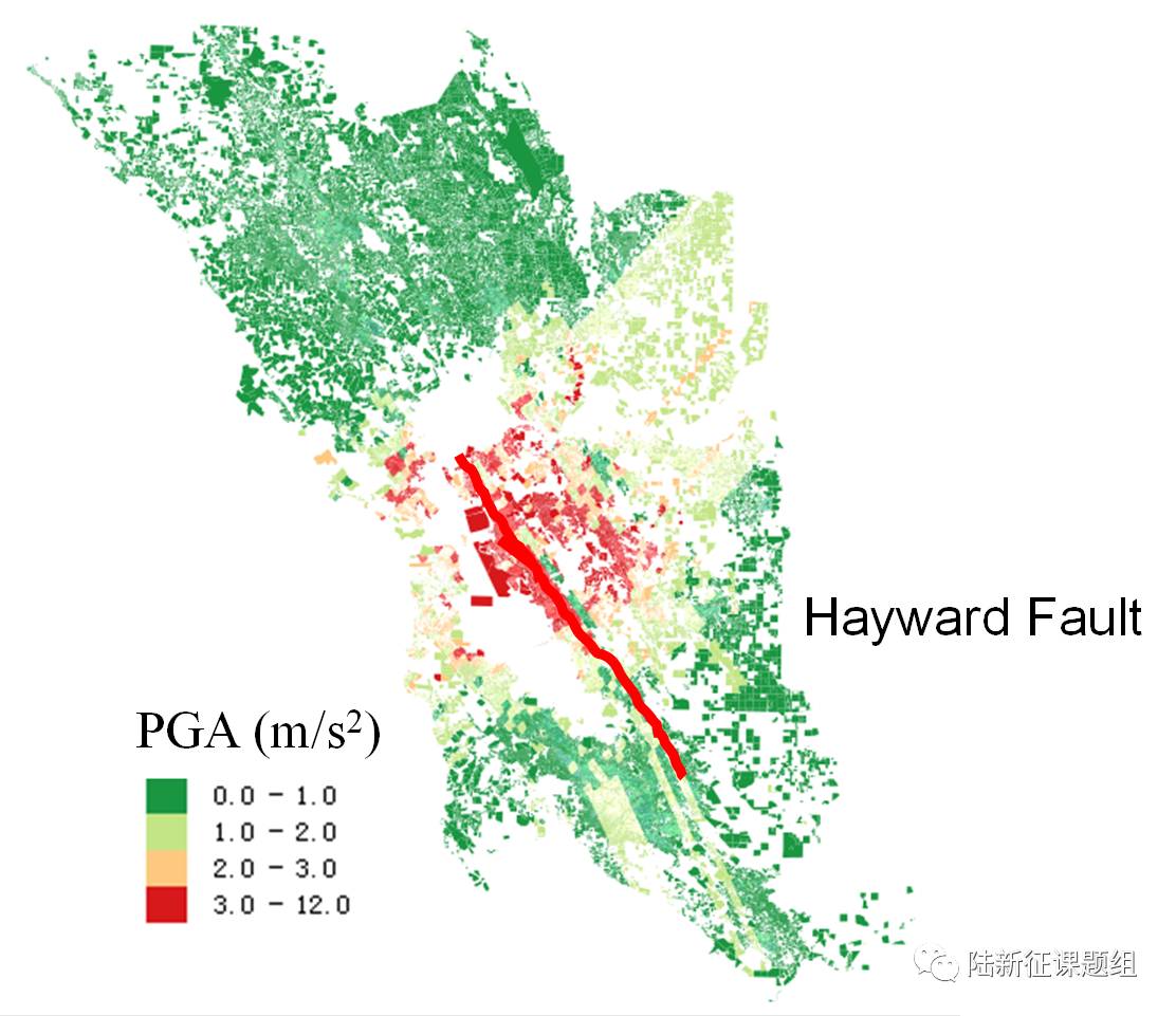 首先,美国劳伦斯-伯克利国家实验室(Lawrence Berkeley National Laboratory, LBNL)国家能源研究科学计算中心利用其29.1千万亿(Pflops)次超级计算机,设定Hayward断层(图10)发生了一场M 7.0级地震,模拟得到了旧金山及周边100 km×100 km×30 km区域的地震动传播过程,以及地表各个网格点处地面运动(图11)。该模拟工作具体介绍参阅:美国国家能源研究科学计算中心完成百亿亿次级近断层地震地面运动模拟。