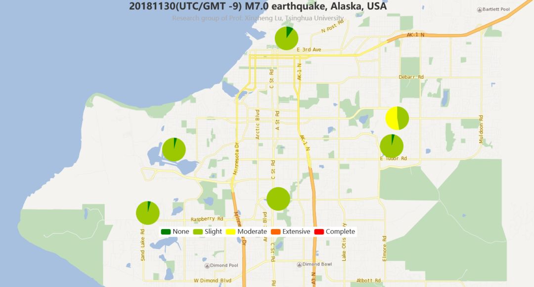 在地震发生后数小时内,清华大学土木系防灾所利用其研发的城市抗震弹塑性分析方法,根据阿拉斯加当地建筑情况及美国工程强震数据中心(CESMD)实测的地面运动记录,分析了本次安克雷奇7.0级地震可能造成的建筑破坏情况(图1)。该分析结果发布后得到广泛关注,美国太平洋地震研究中心(PEER)在其阿拉斯加地震快讯中转载了该分析报告(图2)。