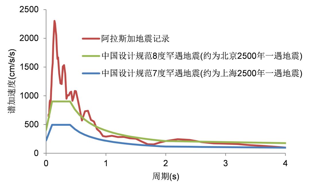 图4 阿拉斯加地震典型地面运动记录反应谱与我国抗震设计标准对比