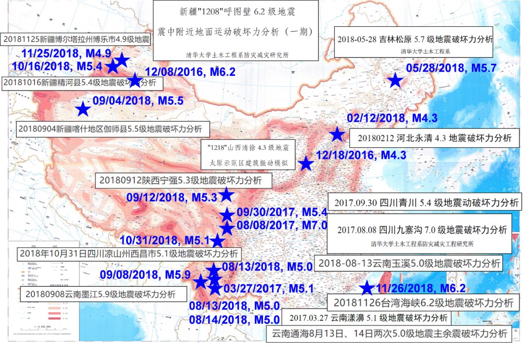 图5 清华大学土木系防灾所近2年来完成的发生在中国的地震应急近实时分析工作