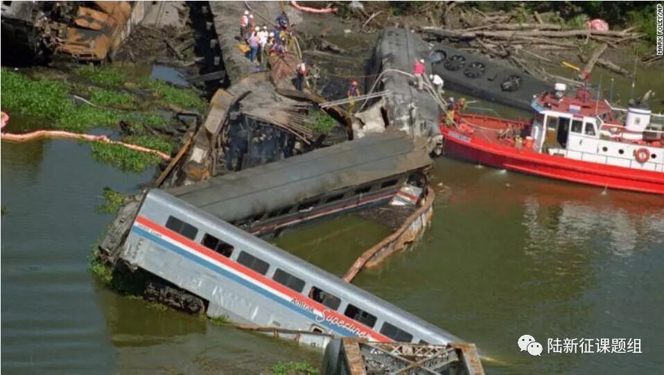 在一艘驳船撞上铁路桥几分钟后,美国铁路公司Amtrak列车开上弯曲的铁轨,列车部分车厢坠入河里并着火。