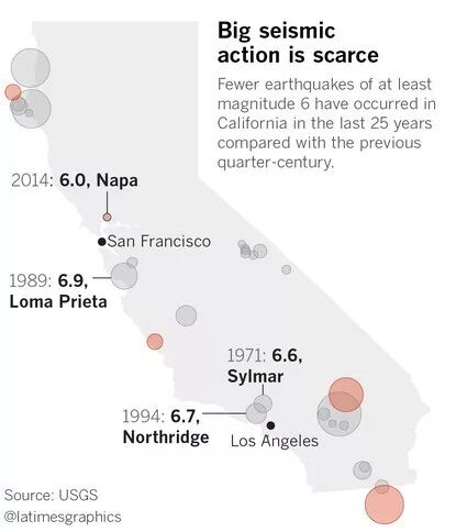 想想看,仅考虑6级或6级以上地震的话,加州有多么平静: