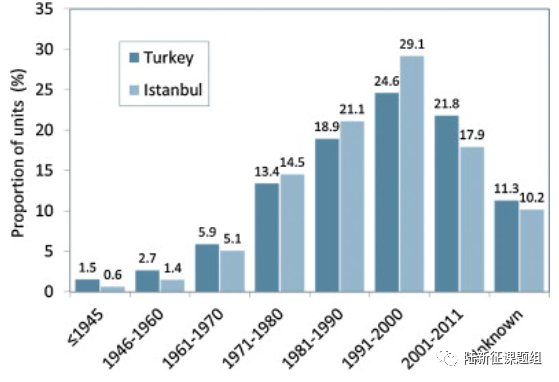根据 2011 年建筑和住房普查报告,伊斯坦布尔和土耳其按建筑年龄划分的居住单位分布如图 3 所示。土耳其第一个国家抗震设计规范于 1944 年发布(译者注:中国第一部建筑抗震国家规范(GB)是1989年),进行了七次修订,最新版本于 2007 年发布(译者注:原文是2015年发表的,当时最新规范是2007版,现在土耳其规范最新版是2018版)。该规范的早期版本主要包含说明性规则。1975 年的版本是第一个与现代地震规范非常相似的版本,而 1998 年的版本实际上可以被视为一个现代地震规范。2007 版本是第一个包含最先进的基于性能的评估概念的版本。