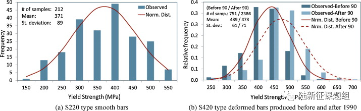 2001 年通过的《施工检查法》(第 4708 号法律)强制要求在建筑中使用预拌(ready-mixed)混凝土并加强现场监督,提高了 2000 年之后建造的建筑物的混凝土质量。Bal 等 (2008) 报告说,获得了 433 座建筑物施工期间的混凝土样品,其 28 天强度呈对数正态分布,平均混凝土强度为 24.9 MPa,标准差为 2.1 MPa。与混凝土的强度一样重要的是建筑物中使用的钢筋的强度和延性。土耳其使用的变形钢筋和光圆钢筋的典型类型分别是 S420 和 S220,其名称表示它的特征屈服强度(以 MPa 为单位)。1970 年代初期建造的钢筋混凝土建筑都使用 S220 钢筋。在 1970 年代至 90 年代后期,使用 S420 钢筋几乎呈线性增长。在 2000 年之后建造的建筑物中,几乎全部使用 S420 钢筋。从现有建筑物中获得的 S220 和 S420 钢筋样品的屈服强度分布如图 8 所示,这些分布是从相当大的数据集中获得的。由于 1990 年之前和之后生产的 S420 钢筋的特性存在显著差异,因此将 S420 钢筋的分布呈现为 1990 年之前和之后。