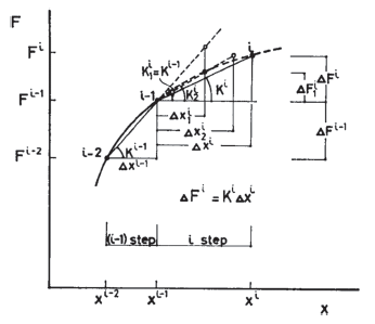 在混合模拟的最初发展中,1975年Takanashi等[6]采用了线性加速方法(也称为“β=1/6的Newmark β方法”)。当时,这种积分方法是结构响应过程分析中最常用的方法之一。因为该方法是隐式的,所以在求解非线性结构时需要进行迭代。为了解决这个问题,他们尝试逐步公式化运动方程,并从试验中估算切线(割线)刚度。他们采用的迭代方法如图2所示[6]。