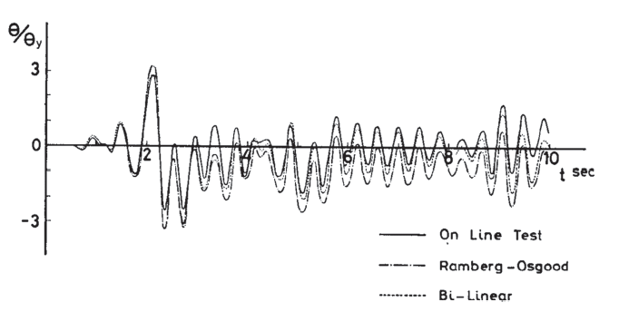 图4是图3A中所示系统在受到按比例缩放的1940年El Centro地震动时的地震响应。这张传奇图片展示了通过混合模拟获得的第一个地震响应过程。图中展示了三个响应。一个是混合模拟获得的响应(标注为“On Line Test”),另一个是具有双线性滞回模型的数值分析获得的响应(标注为“Bi-Linear”),最后一个也是数值分析获得的响应,但使用Ramberg–Osgood模型(标注为“ Ramberg–Osgood”)。人们可以争论它们之间的相关性是否很好,但最重要的是,该图是对“通过施加物理缓慢加载试验获得的实验地震响应”的首次展示。注意在该试验中,Takanashi等特意采用线性加速方法而不是CDM。有趣的是,尽管该试验是混合模拟的第一次实际应用,但它已经采用了子结构的概念。更多细节将在后面的部分中介绍。