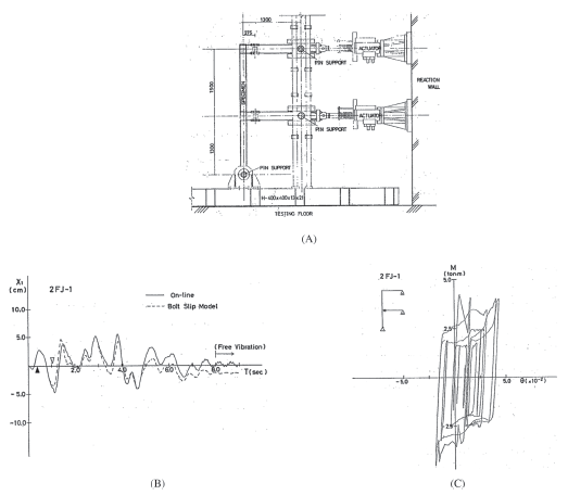 1980年,Takanashi等继续将混合模拟应用于被视为两自由度系统的两层钢框架,其中在每一层(梁)的高度处水平地安装一个执行器[8]。在此试验中,他们使用CDM进行积分。他们还将试验扩展到在梁的末端采用螺栓连接的两层钢框架[9,10]。图5A展示了试验中采用的试件和试验设置。图5B展示了第二层的时程,图5C展示了第二层的螺栓连接处的力矩与转角的关系。注意,通过数值模拟预测的时程也绘制在图5B中(用虚线表示)。在这些试验中,Takanashi等采用CDM来证明混合模拟可以合理地应用于滞回行为非常复杂的结构,其可能涉及滑移,以及相应的承载力突降,即失稳。这主要归功于采用CDM之后不再需要估计割线刚度。