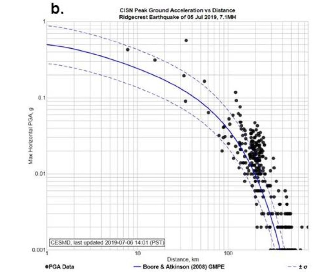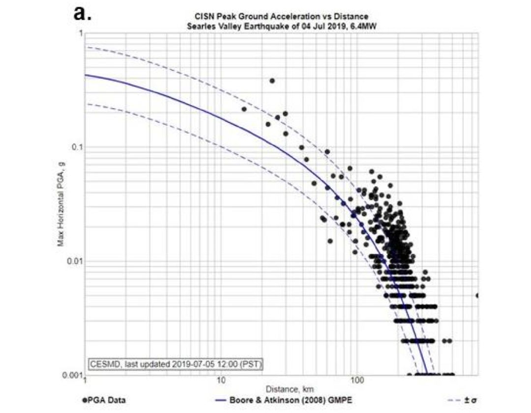 2019年7月4日,加利福尼亚州圣贝纳迪诺县(San Bernardino County)发生了6.4级地震,震源深度10.7公里。震中位于塞尔斯山谷(Searles Valley)西南12公里处。2019年7月5日,同一地点附近发生了7.1级地震,震源深度17公里,地震发生在加利福尼亚州东部莫哈韦沙漠(Mojave Desert)中的一个相当偏远的地区。这两次地震都有强烈的震感,且在6.4级地震之前发生了几次前震,之后又发生了数百次余震。6.4级和7.1级地震的最大地面加速度峰值(PGA)分别为0.38g和0.48g。地震动时程曲线如图1所示,地震动PGA与距离的关系如图2所示,对应5%阻尼比的反应谱如图3所示。