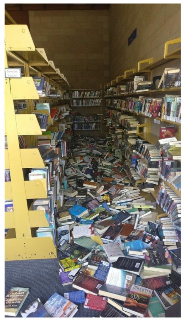 图5 加州Ridgecrest 6.4级地震后,Kern County Library内的书籍散落一地(Credit:Richard Wagner,Source:KTLA,2019)