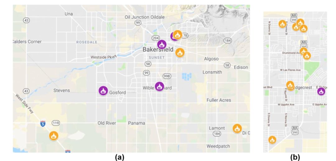 图7 两次地震后克恩县消防局对结构火灾响应的分布;紫色表示6.4级地震后的响应,橙色表示7.1级地震后的响应,(a)位于Bakersfield,(b)位于Ridgecrest