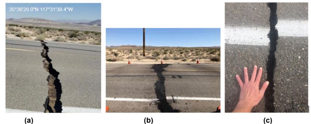 图8 6.4级Ridgecrest地震后的岩土工程破坏(a)横跨Trona路的12英寸(305毫米)宽裂缝,(b)加州运输局9区维修人员对Trona附近178号公路沿线的裂缝进行维修(来源:加州运输局8区推特页面),以及(c)地面分离和偏移(摄影:Emily Guerin)