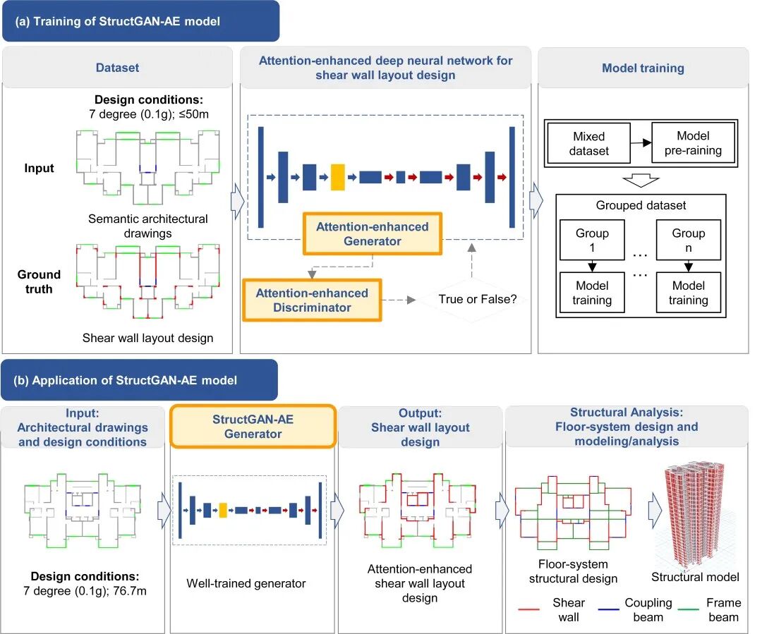 现阶段AI布置的剪力墙在关键部位的细节设计不够完善。注意力机制(Attention)可以加强人工智能对关键部位的学习能力。因此,本研究提出了一种注意力增强的生成对抗网络模型,即StructGAN-AE,用于剪力墙结构的智能设计,并且结合预训练方法以增强模型的普适性。案例表明,相比于此前AI模型,StructGAN-AE能够在电梯井等关键区域生成更加合理的剪力墙局部布置,与工程师设计的相似度提升了14%~50%,混凝土和钢材用量分别减少4.9%和7.5%,而且有着更加良好的抗扭转性能。