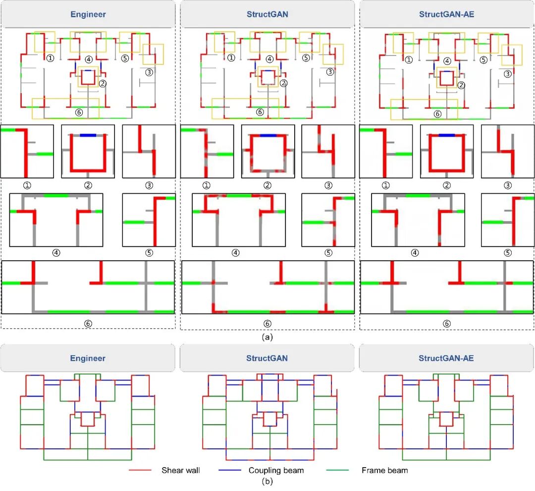 图4 案例研究. (a) 工程师设计、StructGAN设计,StructGAN-AE设计的剪力墙设计细节 (红色表示剪力墙,灰色表示隔墙). (b) 楼盖设计