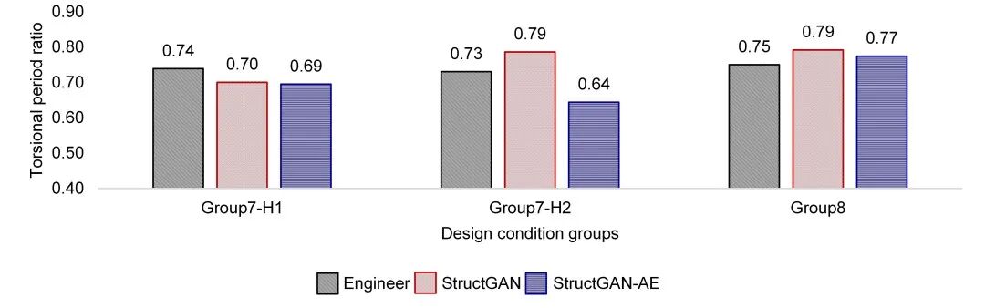 选取测试集中的12个案例作为结构性能分析的案例研究。如图5所示,对于不同设计分组,StructGAN-AE设计结果的平均扭转周期比小于StructGAN,这表明StructGAN-AE的设计结果有着更好的抗扭转性能。