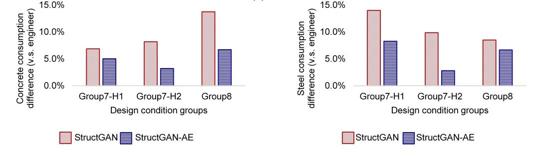 图6也展示了StructGAN和StructGAN-AE的材料用量差异。StructGAN-AE的材料用量与工程师设计结果的差异更小。从12个结构案例材料用量的平均值来看,StructGAN-AE的混凝土和钢材用量与工程师设计结果的差异小于StructGAN与工程师设计结果的差异。