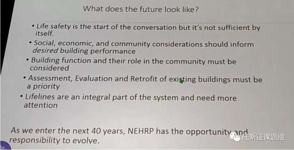 NEHRP是美国从70年代开始,以美国国家科学基金(NSF),联邦应急署(FEMA),国家科学技术研究院(NIST),以及美国地质调查局(USGS)等部门为骨干,协同组织的美国全国规模的地震减灾计划。目前每年NEHRP计划都可以得到美国联邦政府1.3亿美元左右的拨款。我们熟悉的美国抗震规范(如ASCE-7,IBC等等),以及美国的抗震研究报告(如ATC系列报告),我们每天用的地震动数据库(如PEER等等),很多都是NEHRP的成果。到2017年,NEHRP已经走过了40年的历程。McCabe回顾了NEHRP 40年的历史和成就,并重点介绍了NIST近年来在“社区韧性”(Community Resilience)方面开展的工作(注:NIST最近拨款2000万美元设立了“Center for Risk-Based Community Resilience Planning”,当然McCabe要好好介绍介绍)。并提出了NEHRP未来的研究方向。