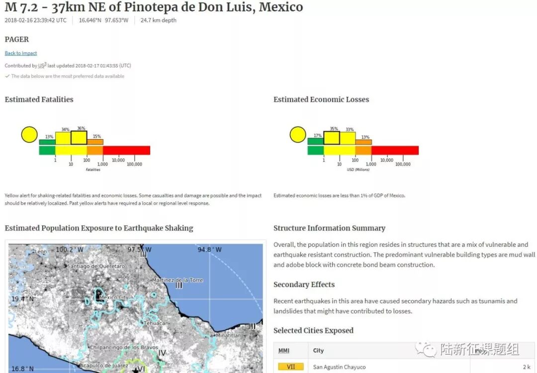 当地时间2018年2月16日17时39分(北京时间2018年2月17日7时39分),在墨西哥(北纬16.60度,西经97.75度)发生了一次7.1级地震,震源深度10km(中国地震台网数据),美国地质调查局(USGS)发布的数据是7.2级,震源深度24.6km。由于去年0919墨西哥7.1级地震曾导致370人死亡,6011受伤,所以这次0216墨西哥地震自然引起了广泛的关注。美国地调局的震害快速预测系统(PAGER)很快就发布了黄色预警,预测死亡人数在10-100人之间(图1)。