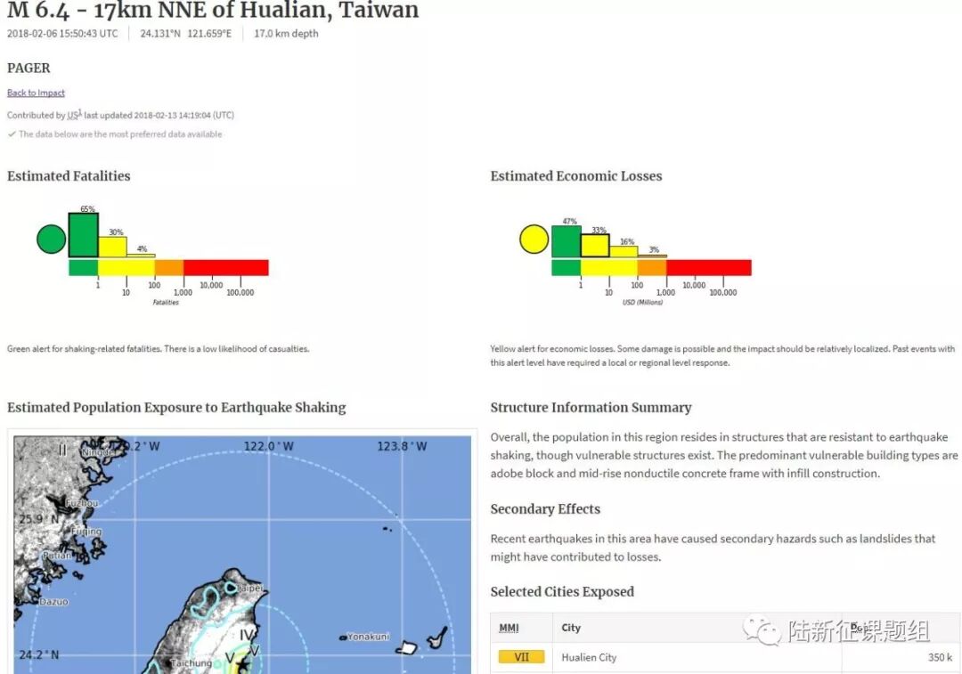 图2美国地调局PAGER系统发布的0206花莲地震损失预测结果