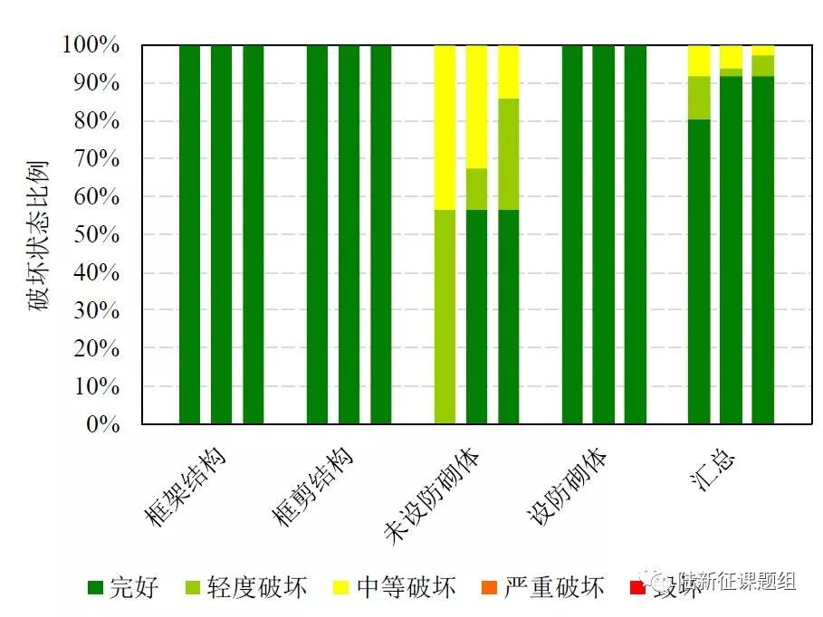 由于没有墨西哥当地建筑的信息,我们就以清华校园建筑为例,进行“城市抗震弹塑性分析”,看看这次地震对区域建筑群的破坏能力如何。得到的震害预测结果如图8所示(由于每个结构的实际抗震能力都是有一定不确定性的,所以我们在新版的程序当中加入了对结构抗力不确定性的考虑,图中每类结构有三列,分别为结构抗力取中位值和加减一倍标准差的预测结果)。可见建筑基本都没有倒塌的风险,因此发生因建筑倒塌导致人员伤亡的风险也就非常小了。